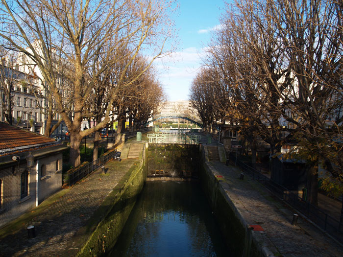 サン・マルタン運河は全長は4.5キロ。ヴィレット公園の前にあるヴィレット貯水池(Bassin de la Villette)とバスティーユ広場から先のアルスナル港をつないでいます(リシャール・ルノワール通りとジュール・フェリー通りの部分は地下水路になっています)。運河上流のヴィレット貯水池の先はウルク運河になり、下流のアルスナル港の先はセーヌ河へ注ぎます。セーヌと違い、わずか5キロの中で25メートルもの高低差があるため、途中に9つの水門(水位調節用の門)があります。高低差のある運河がどこでも水平を保っていられるのは水門のおかげ。船が来ると水門が開き、その様子を周りの人々が楽しそうに眺めています。写真のようにかなり狭い水路もあり、その間をゆっくりと通って行く船の姿を見ていると、流れている時間までゆっくりと過ぎていくような気もちになります。この運河の始まりはナポレオンの時代。飲料水の確保のために1825年に造られました(セーヌ河とウルク運河を結ぶ水路は1806年に完成)。現在は遊覧ボートが行き来し観光用にも使われています。
