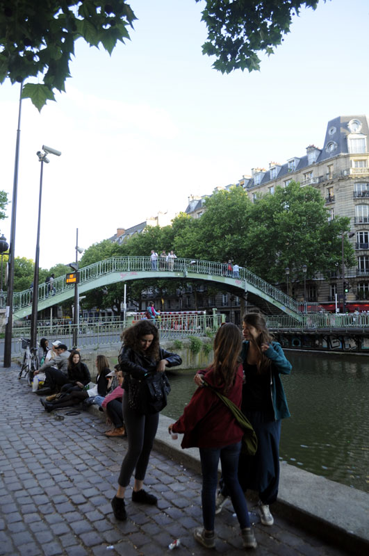 サン・マルタン運河周辺は静かで自由に過しやすいせいか、パリの学生たちが多く集まっています。水辺の端っこに座って食事をしながら話に夢中です。川辺というのは自由を感じられる場所なのかもしれません。ただバカンス近くになるといつも以上に学生が多く、静かというよりは賑やかな場所になります。特に夏はより遅くまで川辺で飲んでいる若者も多いです。またサン・マルタン運河周辺はBOBOの多いエリアです。BOBO(ボボ)は「ブルジョワ・ボヘミアン」の略で、裕福だけどブルジョワ的な生活を拒否した人々のことをいいます。彼らは理想を語り、心が広く、自然環境への関心が強く、連帯感があり、芸術や文化への造詣が深く、高等教育を受けており、裕福ではあるけれど上流階級の価値観や伝統に縛られずに、周りに流されない自由な生活をしています。16区に住む富裕層とは異なったライフスタイルを持ち、サン・マルタン運河周辺の庶民的な地区はBOBOにぴったりの場所といえます。そこには芸術的で専門的な書店、オーガニックな美容院、小さなレストラン、古着屋、雑貨店、ギャラリー、サンドイッチ屋、昔ながらのパン屋などがあり、BOBOたちの日常生活を垣間見ることができます。
