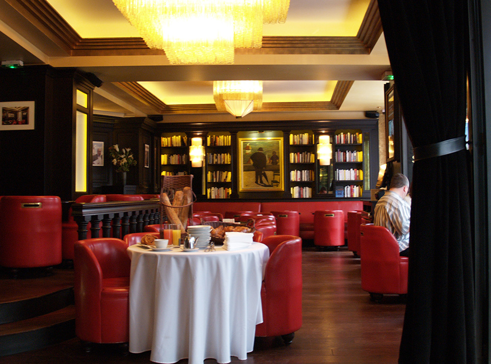 ちょっと気になったら勇気をもって入ってみるのも良い体験です。店内も鮮やかな赤で統一され、大きな書棚が置かれています。そこには5000冊以上の本が置いてあり、作家や読書家向けのお店です。書棚の横に掛けられた巨大時計がカフェのシンボルとなっていて、それは時間を大事にする編集者の意識を表現しているのかもしれません。メニューはフランスのカフェ伝統のもので、毎朝コーヒーやプティ・デジュネ(朝食セット)を注文することができます。薄暗い図書館のような雰囲気ですが、店は外に大きく開かれ、店内からはサン・ジェルマン界隈の様子がよく見えます。たまには椅子に座ってゆっくりとオデオン界隈を歩く人々を眺めるのも新鮮な経験です。