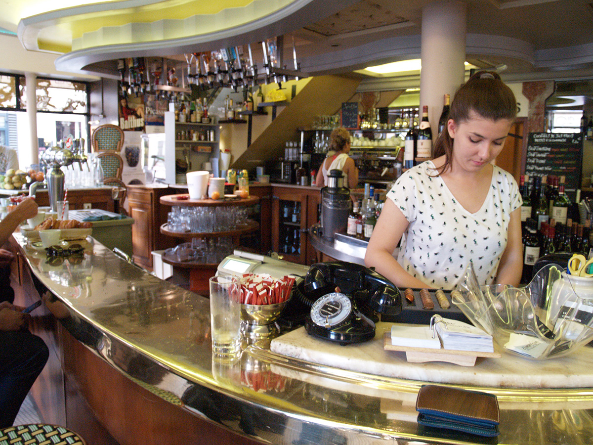 サン・ジェルマン・デ・プレにある古いカフェ。昔ながらの錫製のカウンター、黒電話などがあり、地元の人たちが通うパリの典型的なカフェです。床には古い時代の貴重なデザインタイルが残っています。カフェのカウンター